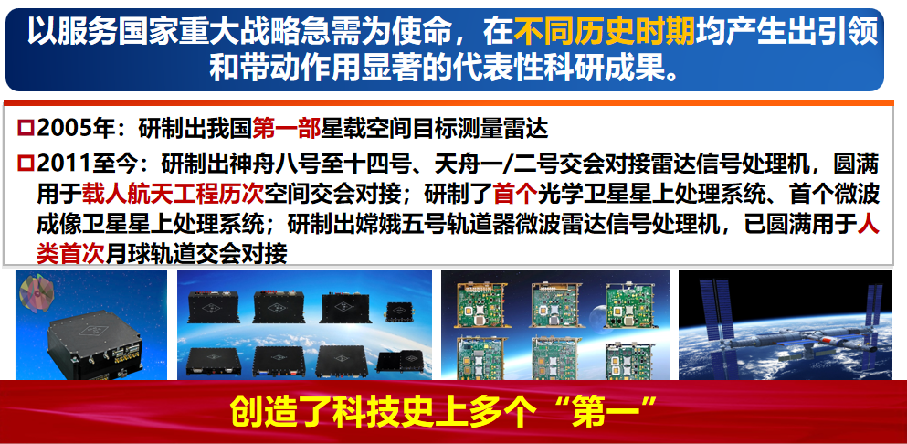 创造了我国科技史上多个“第一”:第一台电视发射接收装置、第一部低空测高雷达、第一个相控阵体制雷达、第一个微波成像星上处理系统、第一个空间交会对接测量微波雷达信号处理系统、第一个卫星通信阵列在轨测量装置等,深度服务于国土防护、航天遥感、载人航天、卫星导航等国家重大专项和重大工程。正在牵头“中国复眼”—大规模分布孔径深空探测雷达的建设。2011年以来,学院牵头获得国家技术发明奖一等奖1项、二等奖6项。